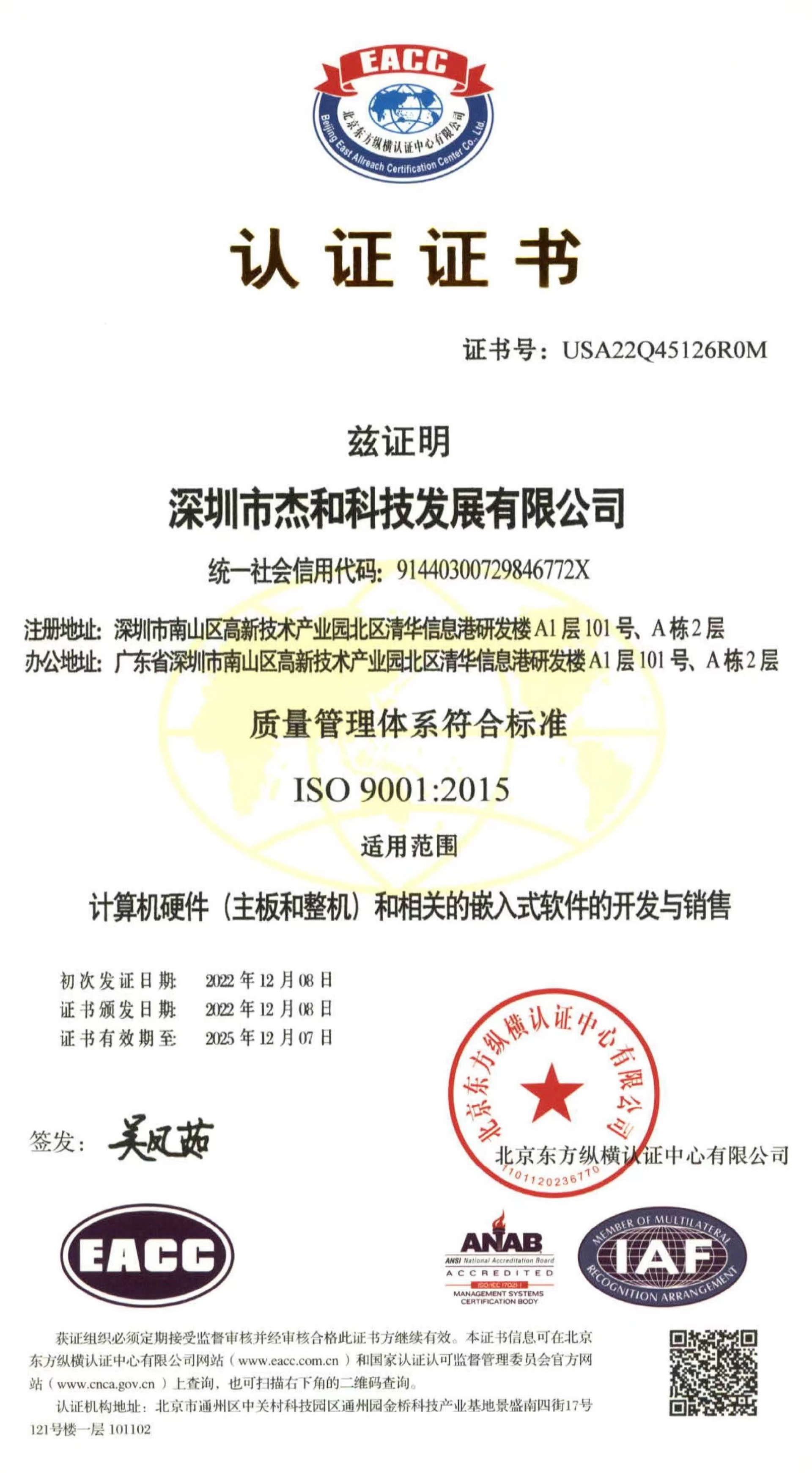 ISO9001质量管理体系认证作为国际标准化组织的管理性质标杆,它的地位可见一斑,其认可彰显了乐鱼科技的体系管理以及产品的质量。乐鱼科技在过去几年不断提升设备标准化生产的能力,减少人为质量问题,把ISO9001质量管理体系理念贯穿于产品研发—生产全流程。