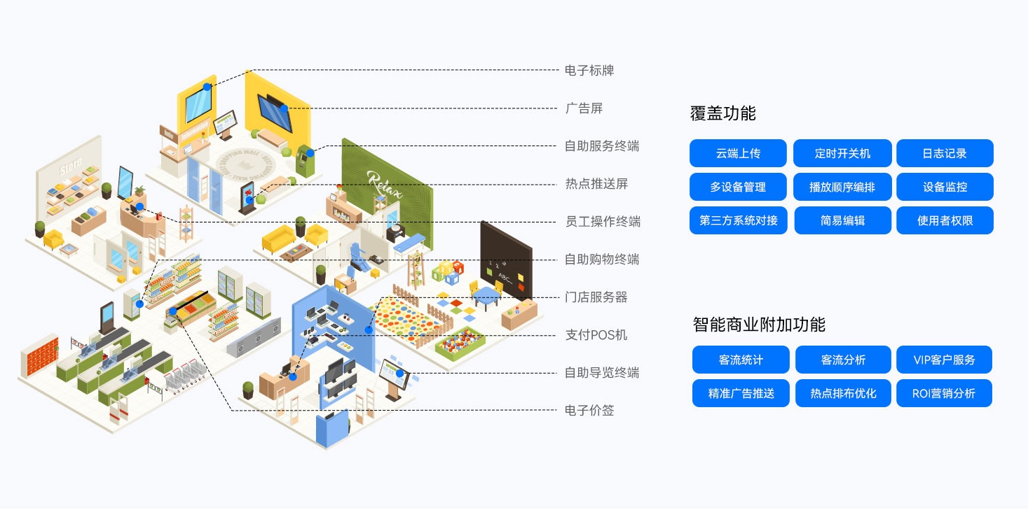 乐鱼智慧零售解决方案搭配乐鱼GDSM-ES智能零售管理系统,为全球零售门店客户提供了功能齐全的数字化运营管理工具,提供广告显示信息编辑、信息发布、AI识别、客户分析和会员管理等功能,实现对设备、内容、营销、运营的综合数智化管理能力,为精准运营管理赋能。