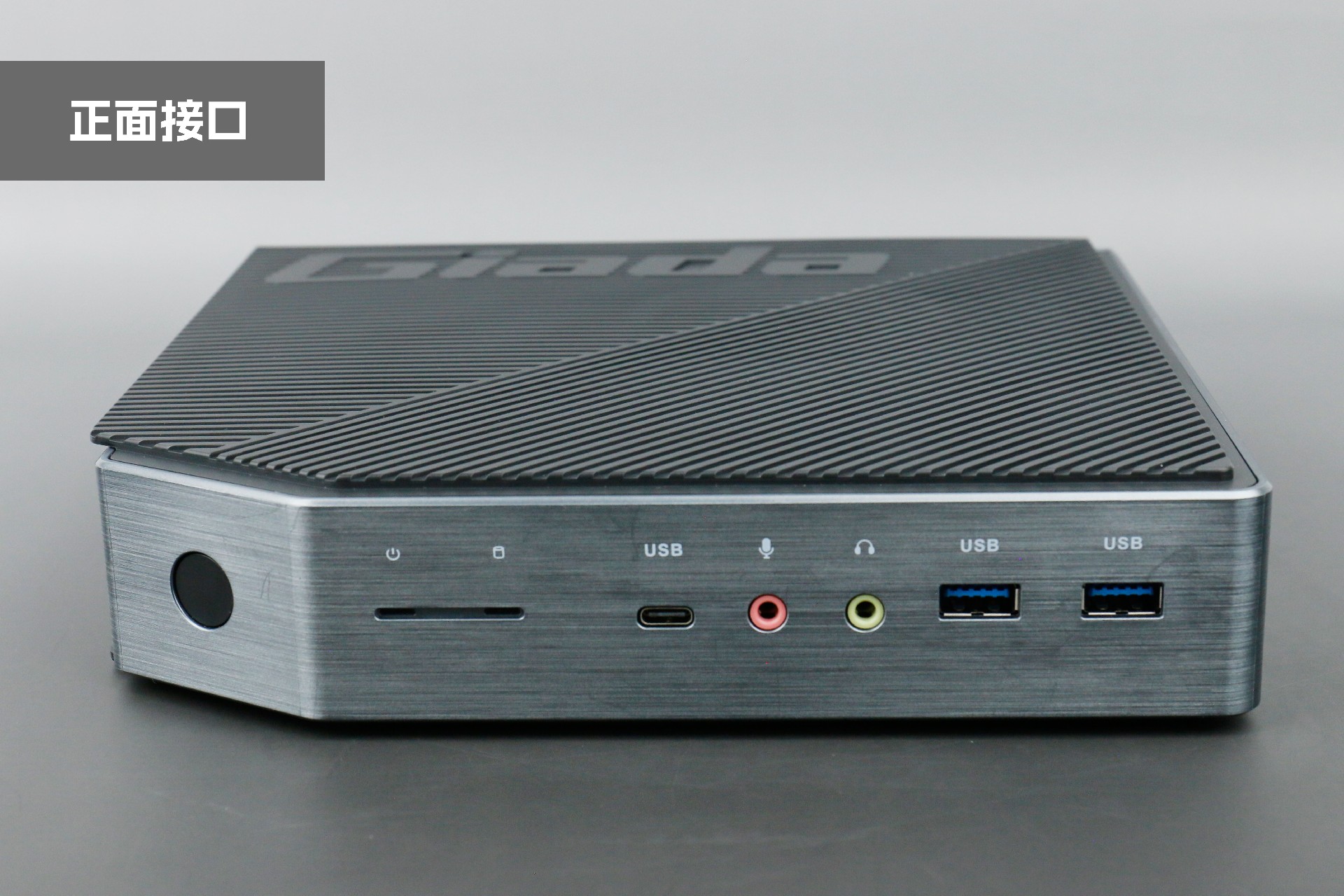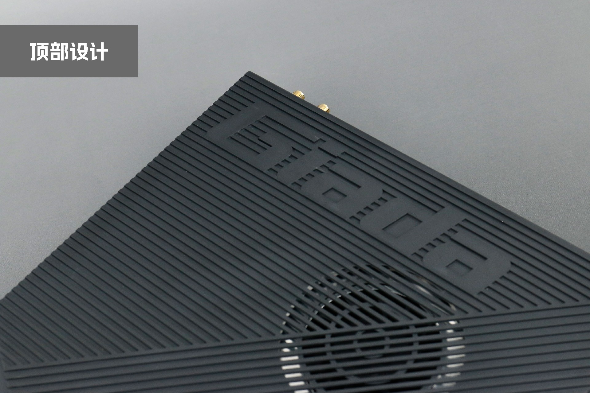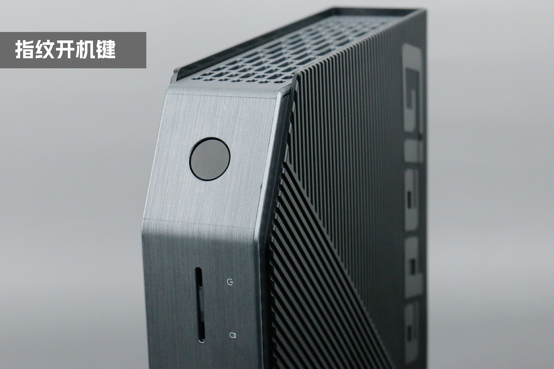 打开乐鱼桌面云终端Y-BOX P3,你会发现它的结构并不是常见的四方体设计,而是在转角处好似被切割开一个角,切割出来的面积为指纹识别开机键。它的外观为优雅的银灰配色,机身正面厚重感十足,顶部依然沿用黑色哑光栅格并延伸至整机背面,磨砂塑胶材质壳,印刻乐鱼Giada品牌名;其他三面则为银灰色,两侧是蜂窝式通风口设计。